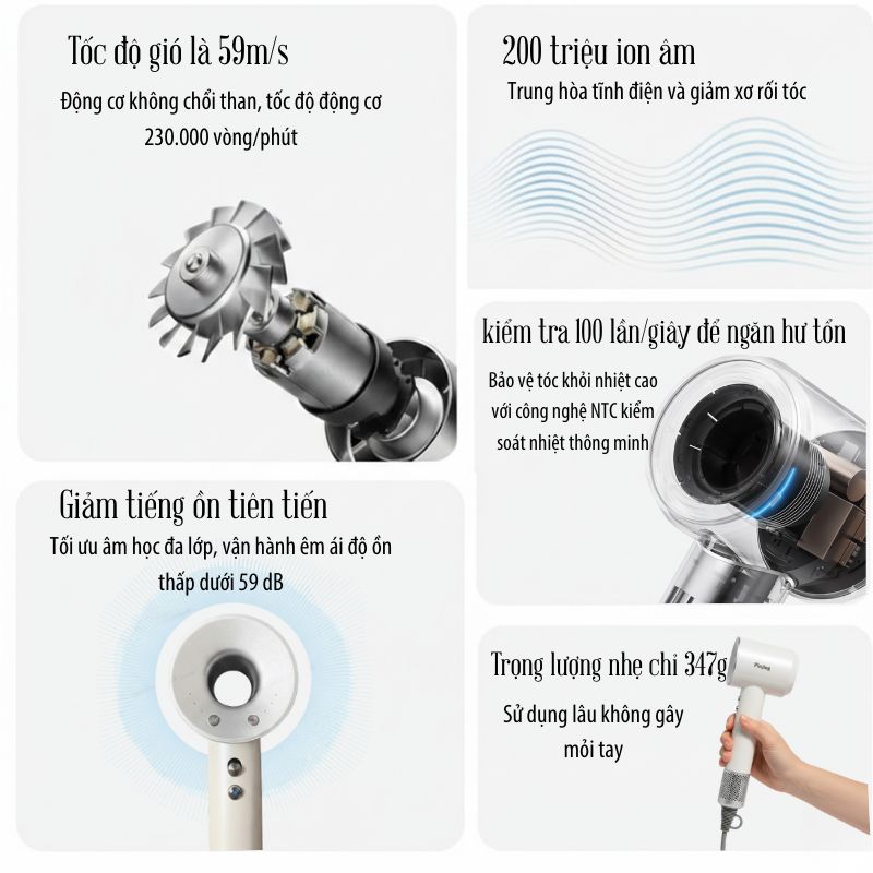Bạn có biết, nhiệt độ quá cao từ máy sấy thông thường là "kẻ thù" số 1 gây ra tình trạng tóc khô xơ và chẻ ngọn? Máy sấy tóc thông minh Pinjing H01 ra đời với sứ mệnh thay đổi hoàn toàn trải nghiệm sấy tóc của bạn bằng công nghệ động cơ không chổi than tiên tiến và hệ thống bảo vệ tóc thông minh.
