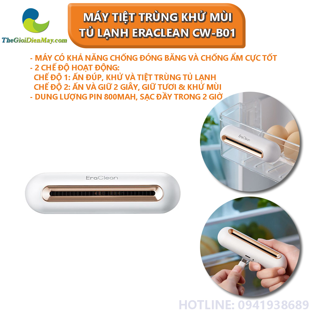 Máy tiệt trùng khử mùi tủ lạnh EraClean CW-B01 sở hữu kích thước nhỏ gọn, 2 chế độ khử trùng và khử mùi linh hoạt. Bên cạnh đó cơ chế khử trùng tuần hoàn 360° tác động lên mọi ngóc ngách trong tủ lạnh. Sản phẩm còn được trang bị dung lượng pin lớn với thời gian dùng lên tới 30 ngày khá tiện lợi.