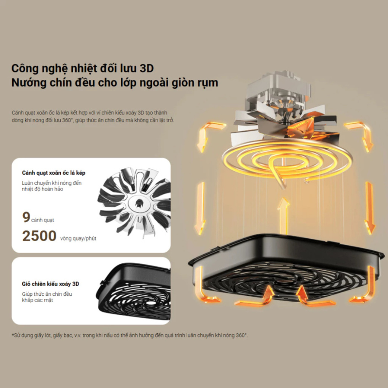 Điểm cốt lõi tạo nên sự khác biệt của Xiaomi Air Fryer Essential 6L chính là công nghệ gia nhiệt đối lưu 3D tiên tiến. Công nghệ này là sự kết hợp hoàn hảo giữa hai bộ phận quan trọng: cánh quạt xoắn ốc hai vây và đĩa chiên lốc xoáy 3D. Cánh quạt với 9 lá, hoạt động với tốc độ lên đến 2500 vòng/phút, tạo ra một luồng khí nóng mạnh mẽ và lưu thông liên tục. Luồng khí này sau đó được đĩa chiên lốc xoáy 3D phân bổ đồng đều khắp mọi ngóc ngách bên trong lòng nồi, tạo thành một vòng tuần hoàn nhiệt 360 độ. Kết quả là nhiệt lượng có thể thẩm thấu sâu và đều vào thực phẩm từ mọi phía, giúp món ăn chín vàng, giòn rụm từ ngoài vào trong mà không cần phải tốn công lật, trở giữa chừng. Vì thế, gia nhiệt đối lưu 3D là tính năng cốt lõi của Nồi chiên không dầu Xiaomi 6L BHR8588EU, hỗ trợ chế biến các món ăn như rau củ hoặc thịt mà vẫn giữ được độ giòn tự nhiên giúp người dùng tối ưu được công việc nấu nướng thường ngày.