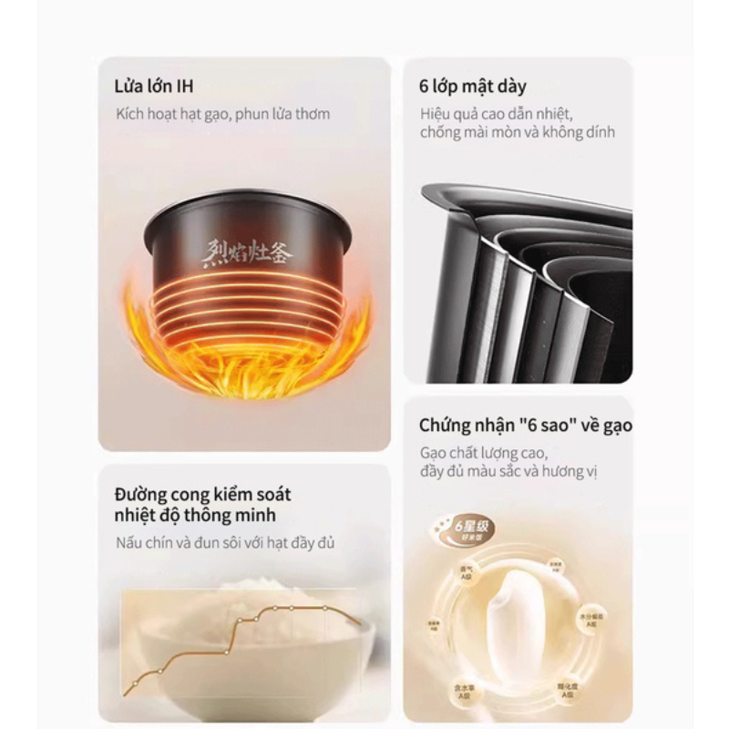 Sau nhiều năm phát triển các sản phẩm Nồi cơm điện cao tần thông minh, Xiaomi Mijia IH S1 đã nâng cao sáu khía cạnh quan trọng của gạo ngon. Được chứng nhận bởi các tổ chức uy tín, sản phẩm đảm bảo chất lượng 6 sao. Nồi cơm giúp bạn dễ dàng tạo ra một bát cơm hoàn hảo với màu sắc, hương thơm, mùi vị, hình dáng, kết cấu và độ chín đều đạt tiêu chuẩn 6 sao.