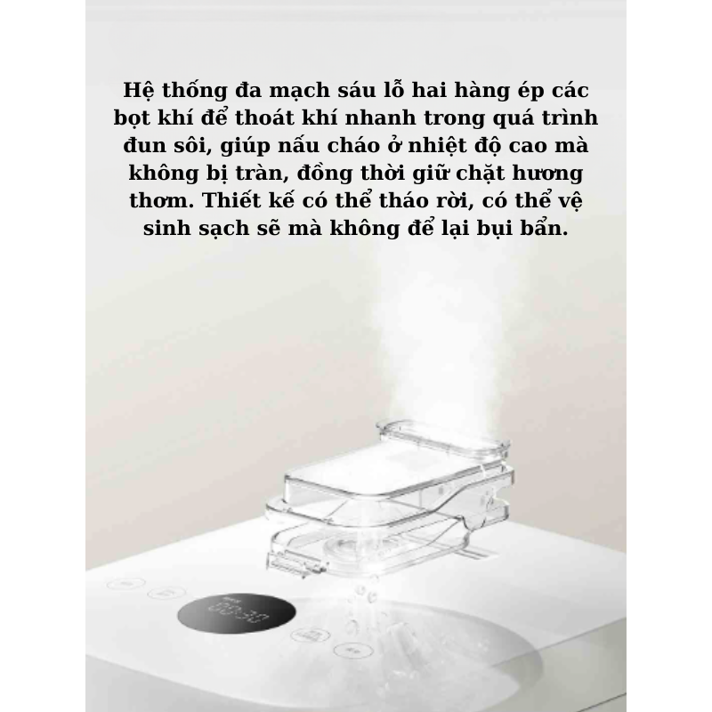 Nồi cơm điện cao tần điện Mijia IH S1 giúp khuấy và đun sôi hiệu quả, giữ cơm thơm ngon và ngăn ngừa tràn nồi. Mạch đa năng với sáu lỗ và hai dãy ép bong bóng hỗ trợ thoát khí nhanh chóng trong quá trình nấu cháo ở công suất cao, bảo đảm không bị tràn nhưng vẫn giữ được hương vị đậm đà. Thiết kế tháo rời cho phép vệ sinh dễ dàng và triệt để, đảm bảo không còn bụi bẩn.