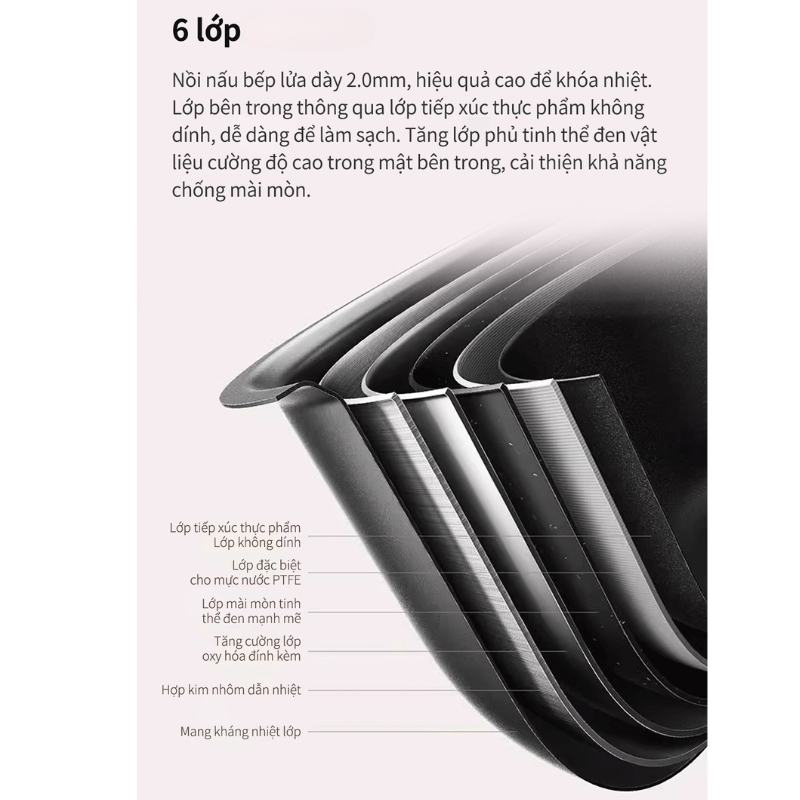 Lòng nồi có 6 lớp bàng dày, khóa nhiệt đều, chống dính và bền hơn: