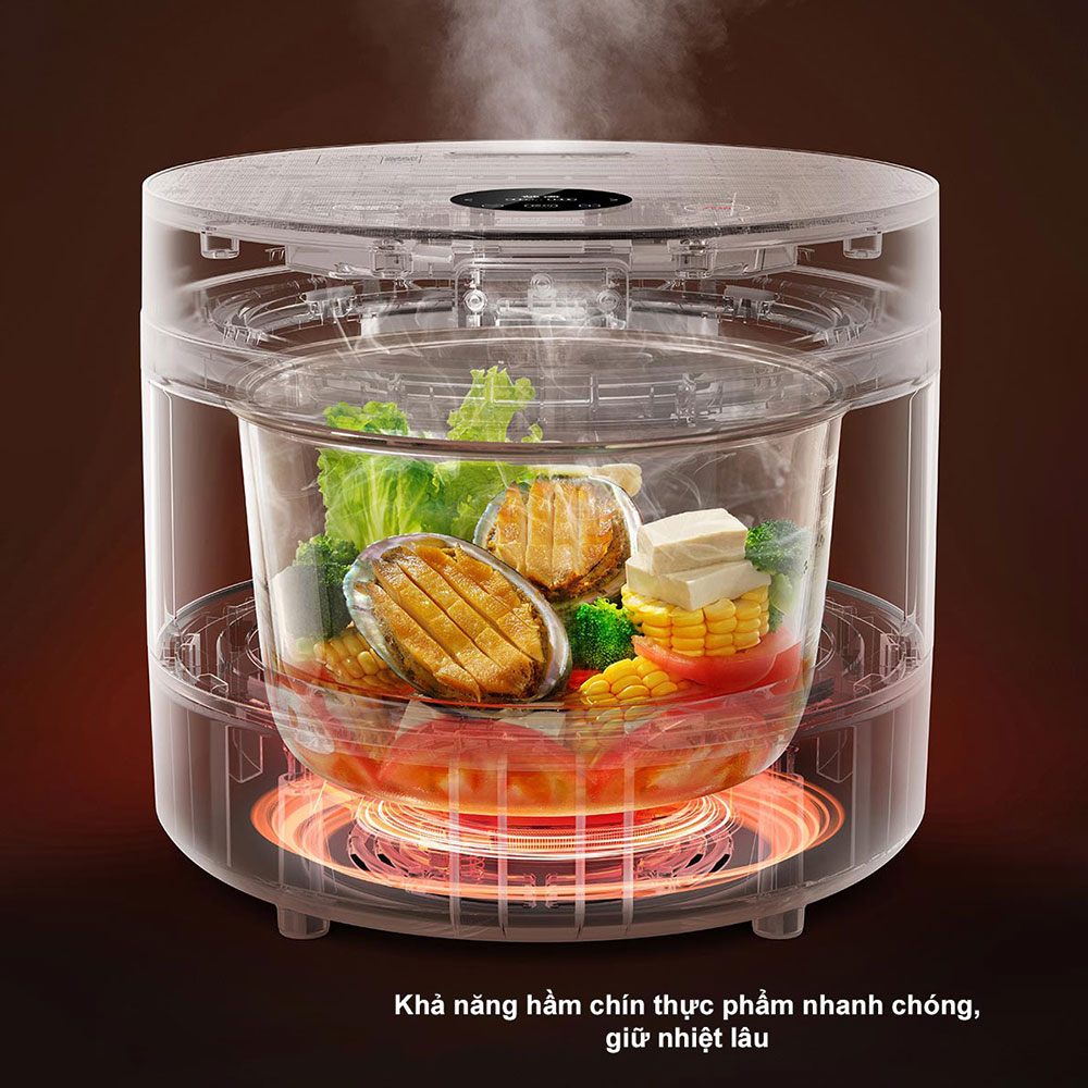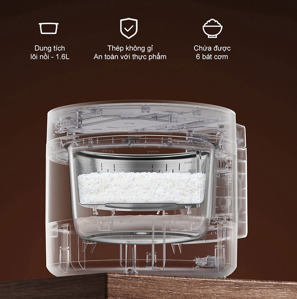 Ở chế độ hấp, phần lõi có thể chứa được đến 1.6L thực phẩm, tương đương với 6 bát cơm. Thiết kế nhiều rãnh nhỏ bao quanh lõi nồi, giúp tách nước vo gạo dễ dàng hơn. Bên cạnh đó còn có các chế độ như hầm canh, nấu cháo, ninh nhừ hoặc ủ sữa chua, người dùng có thể tùy chỉnh linh hoạt trên APP Mijia.