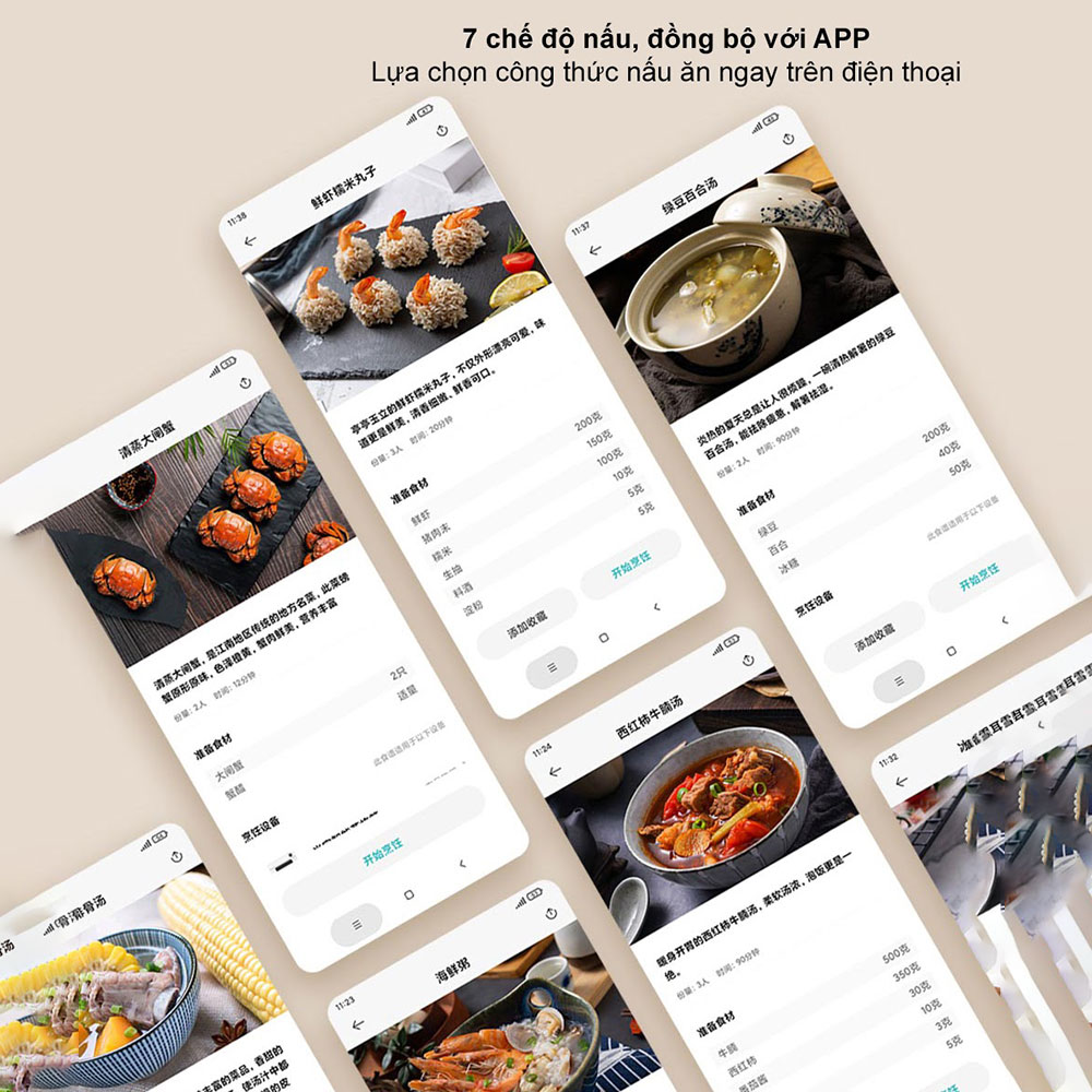 Nồi điện đa năng Xiaomi còn được tích hợp sẵn 7 chế độ nấu, giúp bạn linh hoạt chế biến và nấu được nhiều loại món ăn đa dạng. Ngoài ra, với việc kết nối APP thông minh, người dùng còn có thể lựa chọn công thức nấu trực tuyến dễ dàng ngay trên điện thoại di động.