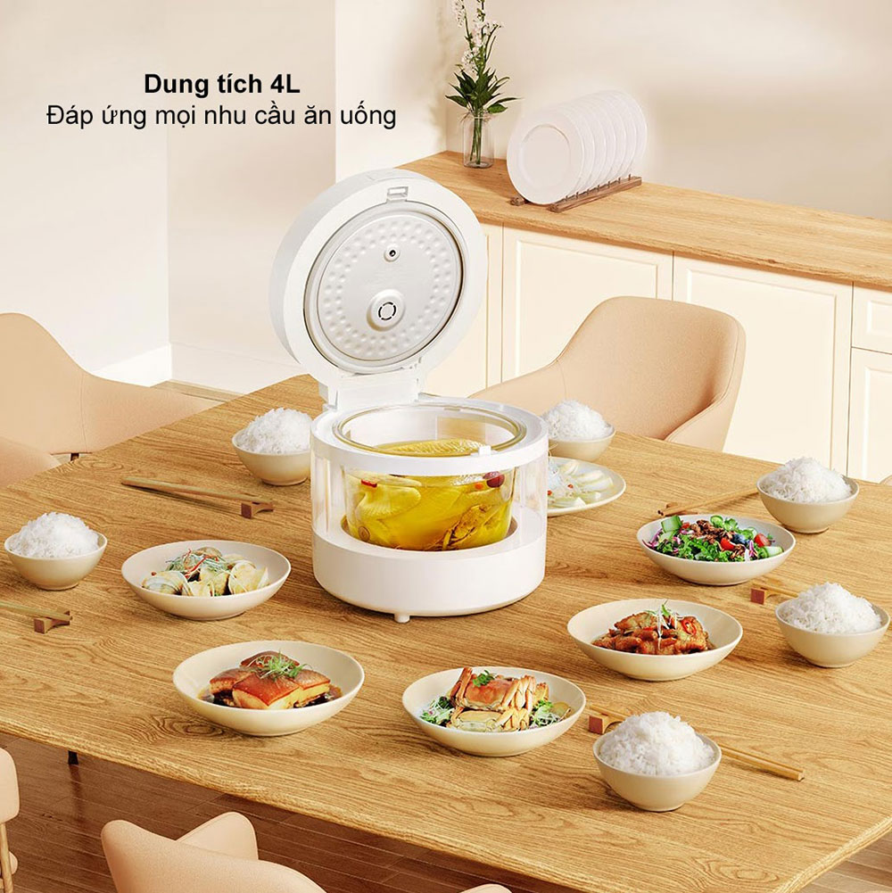 Nồi cơm điện giá rẻ Xiaomi có dung tích 4L, đủ cho nhu cầu ăn uống của cả gia đình. Bao quanh là lớp kính cường lực dày được làm bằng thuỷ tinh borosilicat, có khả năng chịu nhiệt cao ở cả hai trạng thái nóng và lạnh, độ bền cao, không dính cơm và dễ lau chùi, không bị bong tróc lớp sơn phủ kể cả khi sử dụng trong thời gian dài. Bên cạnh đó, vật liệu này còn giúp thực phẩm chín nhanh và đều hơn, đảm bảo tiết kiệm tối đa thời gian nấu cho người dùng. Lõi nồi sử dụng chất liệu thép không gỉ cao cấp, đạt chuẩn tiếp xúc với thực phẩm, an toàn cho sức khỏe.