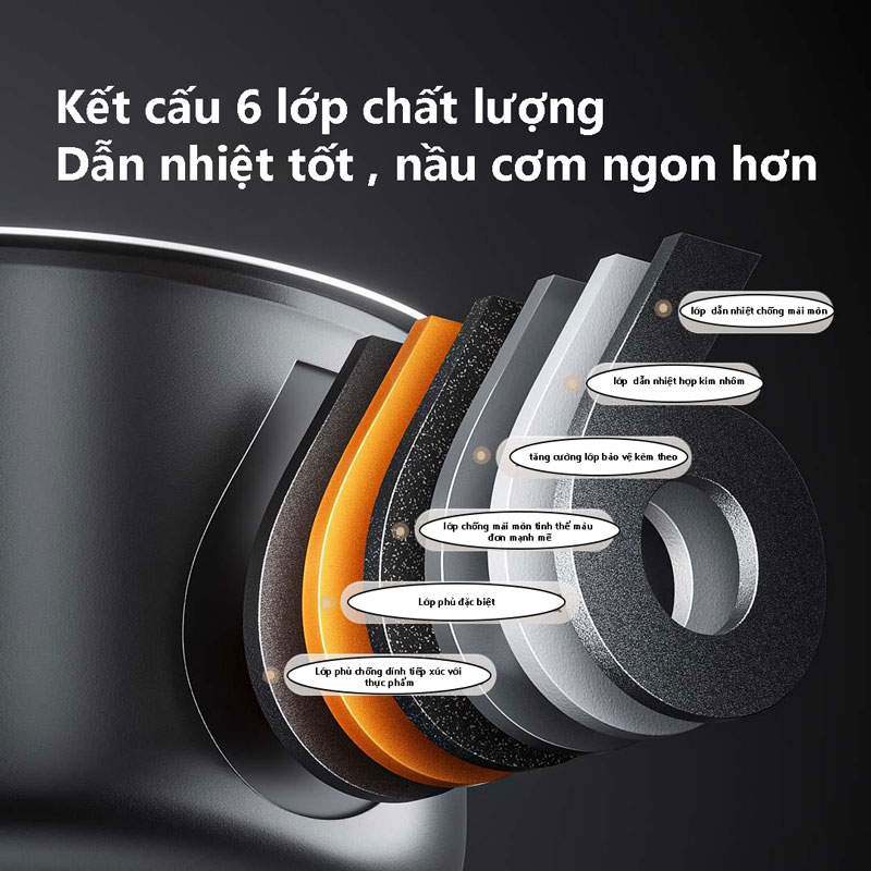 Hệ thống 2 đầu dò nhiệt độ NTC thông minh giúp kiểm soát nhiệt độ nấu nướng chính xác, đảm bảo cơm chín đều, không bị cháy hay sống. Lòng nồi 6 lớp vật liệu cao cấp chống dính hiệu quả, giúp thức ăn không bị bám dính vào lòng nồi, dễ dàng vệ sinh sau khi sử dụng.