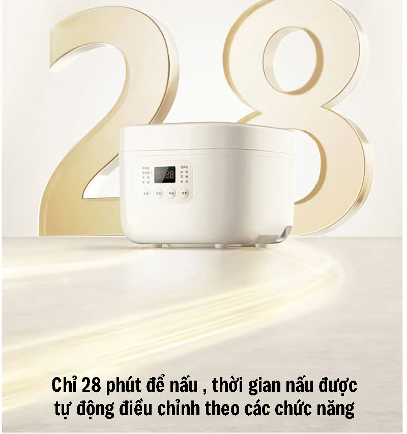 Mặc dù nhỏ gọn, Nồi cơm điện Mijia N1 3L vẫn sở hữu khả năng nấu cơm nhanh chóng chỉ trong 28 phút, giúp bạn tiết kiệm thời gian nấu nướng hiệu quả. Khi mở nắp, bạn sẽ cảm nhận được mùi thơm đặc trưng của gạo mới nấu lan tỏa. Hạt cơm chín đều, bóng bẩy và dẻo ngon, minh chứng cho chất lượng 4A vượt trội của sản phẩm.
