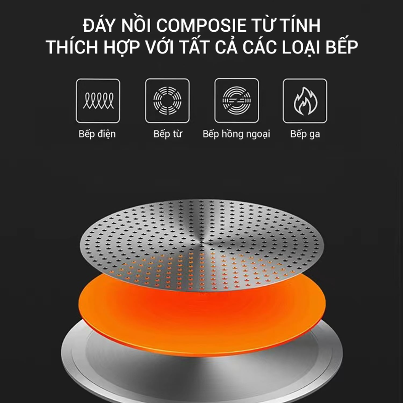 | Khả năng tương thích | Đáy nồi Composie từ tính phù hợp với mọi loại bếp |