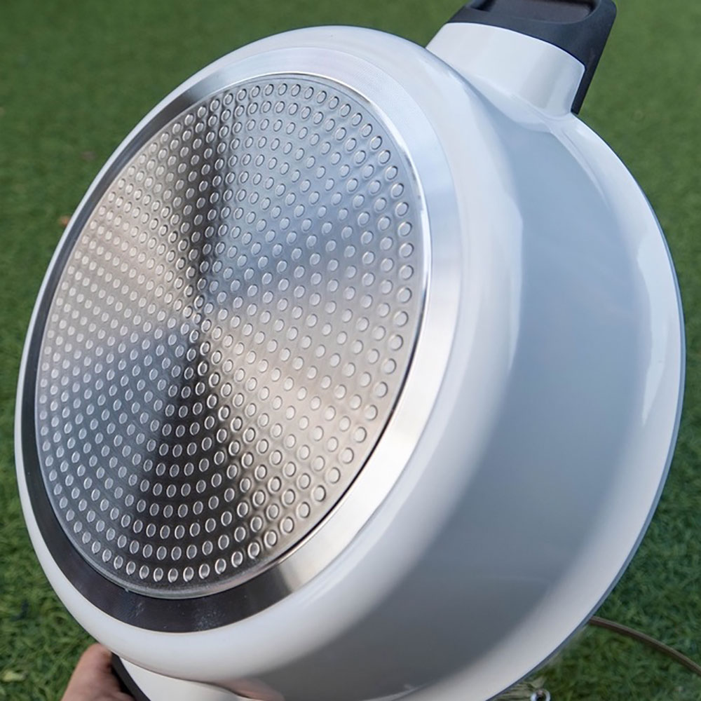 Đáy nồi thép không gỉ dẫn nhiệt tốt. Tương thích với nhiều loại bếp thông dụng hiện nay.
