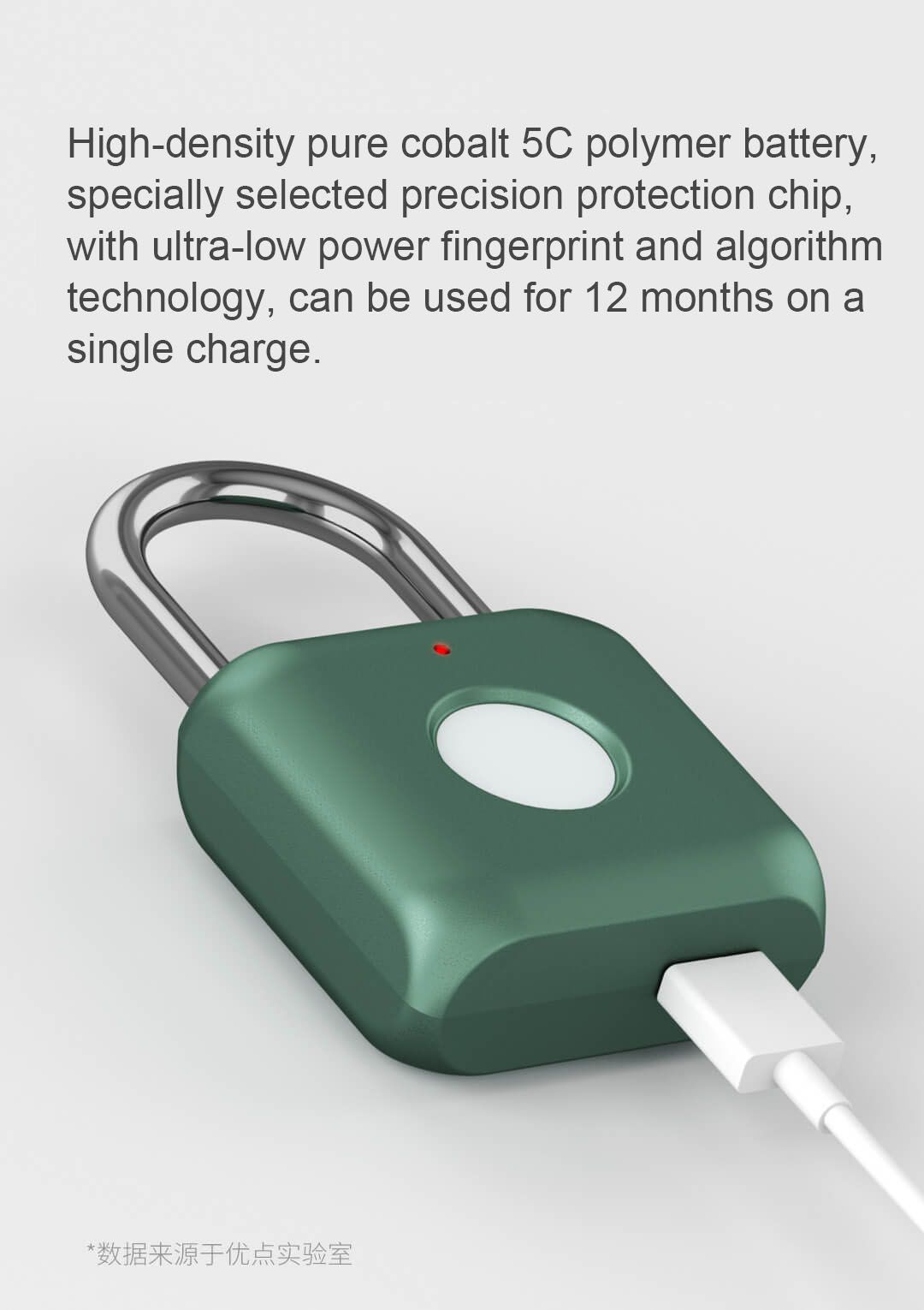 Bên cạnh đó, ổ khóa vân tay còn được trang bị viên pin polymer 5C với mật độ cao, thuật toán nhận diện vân tay tiêu tốn năng lượng cực thấp nên sẽ tiết kiệm năng lượng tốt hơn. Chỉ với 1 lần sạc đầy ổ khóa qua giao diện micro USB thì người dùng đã có thể sử dụng liên tục hơn 12 tháng.