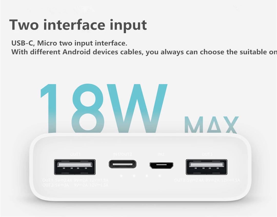 Trong khi đó cổng USB-C đảm nhận 2 chức năng vừa là cổng input đồng thời cũng là cổng output. Đặc biệt cổng này có thể cung cấp chức năng sạc nhanh hai chiều lên đến 45W MAX. Pin sạc dự phòng Xiaomi cung cấp khả năng sạc cho nhiều thiết bị khác nhau từ điện thoại di động cho đến máy tính xách tay thông qua giao diện USB-C như MacBook hay các dòng Acer Switch. Ngoài ra giao diện đầu ra USB-A còn có thể sạc cho tai nghe bluetooth hoặc các smart watch.