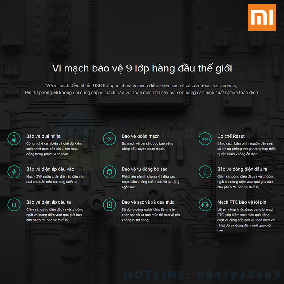 Pin sạc dự phòng 10000mAh Xiaomi gen 3 18W còn được đặc biệt trang bị chip mạch chất lượng cao giúp cải thiện tỷ lệ chuyển đổi và cung cấp dòng điện ổn định hơn cho các thiết bị sạc. Ngoài ra các tính năng bảo vệ như quá nhiệt, ngắn mạch, quá áp, quá dòng, chống quá tải,... cũng được tích hợp đầy đủ để bảo vệ an toàn cho các thiết bị sạc và người dùng.
