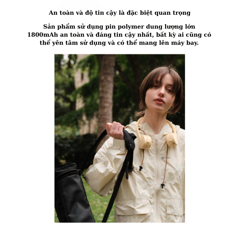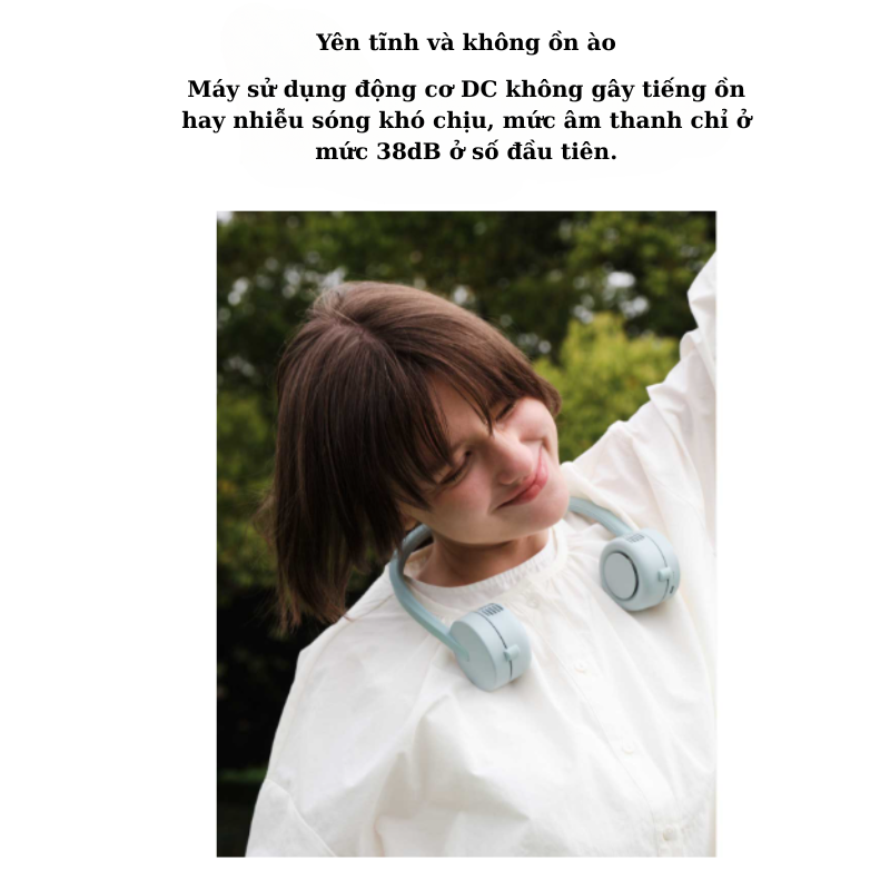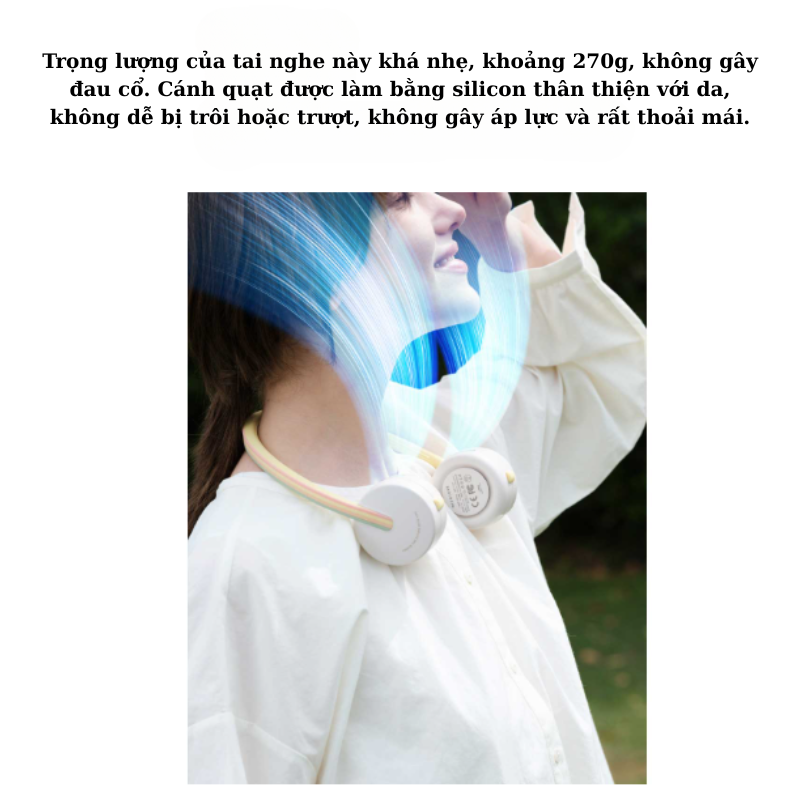 Với trọng lượng chỉ 270g, quạt đeo cổ được thiết kế để ôm trọn vùng cổ một cách nhẹ nhàng, không gây áp lực lên cơ thể, phù hợp cho mọi đối tượng từ trẻ em đến người lớn.