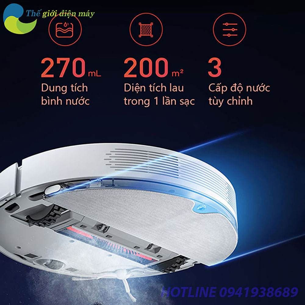 Nhà sản xuất trang bị bồn chứa nước với dung tích 270ml cùng với 3 cấp độ nước tùy chỉnh (ít, vừa, nhiều). Thoải mái cung cấp lượng nước để Robot thực hiện nhiệm vụ lau sạch của mình. Bạn chỉ cần cài đặt lượng nước phù hợp cho chất liệu sàn nhà bạn (Với sàn gỗ bạn nên chọn chế độ nước thấp, với sàn đá hoa bạn lên chọn mức mước trung bình hoặc nhiều). Sẽ giúp tối ưu hóa khả năng lau sạch của Robot.