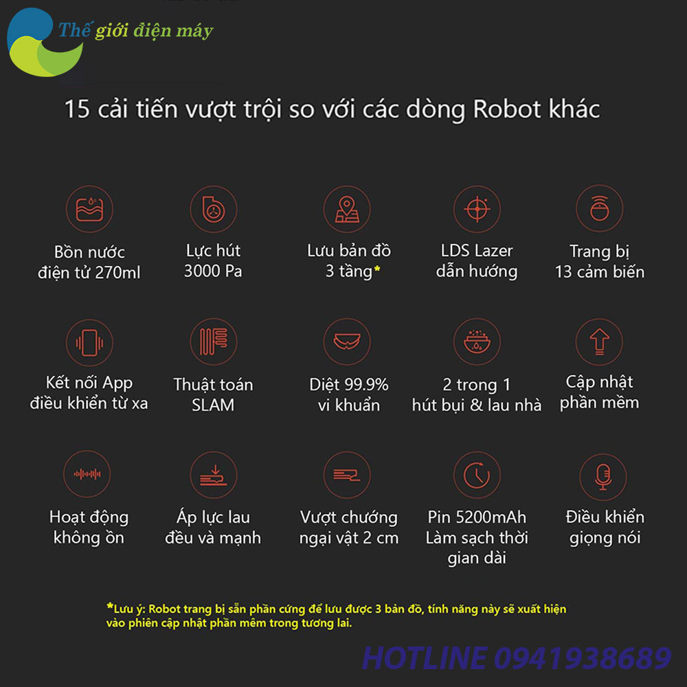 Với 15 cải tiến vượt trội so với các dòng robot khác. Robot Hút Bụi Lau Nhà thông minh Xiaomi Dreame D9 hẳn là một sản phẩm đáng để lựa chọn với động cơ Nidec Nhật bản, cùng khả năng lưu sơ đồ 3 tầng.Lực hút 3000Pa, hút sạch 99,9% các vết bẩn. Được trang bị lực hút lên đến 3000 Pa mạnh. Với phiên bản robot này hoàn toàn có thể hút sạch các hạt bụi mịn, ngay khi chúng đang ở dưới rãnh sâu (khe gạch lát, tấm gỗ lát).
