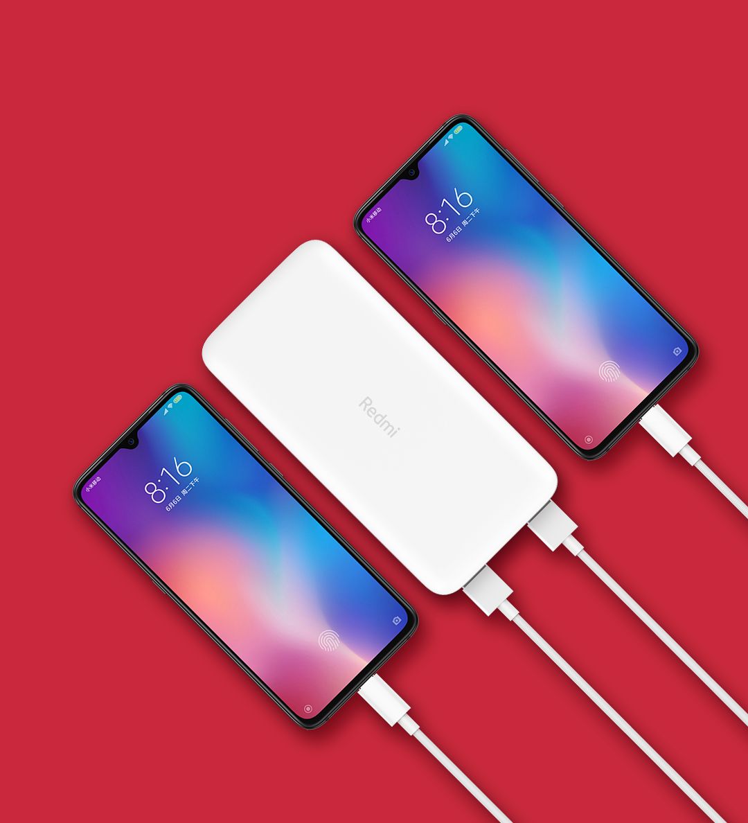 Bên cạnh đó pin sạc dự phòng Redmi được tích hợp 2 đầu ra USB-A có thể sạc cùng lúc 2 thiết bị khá thông minh. Tham số đầu ra của 1 cổng là 5.1V 2.4A và khi sử dụng cả 2 đầu ra thì công suất đạt 5.1V 2.6A, có thể nhanh chóng đáp ứng các yêu cầu sạc của các thiết bị điện tử như điện thoại di động và máy tính bảng,....