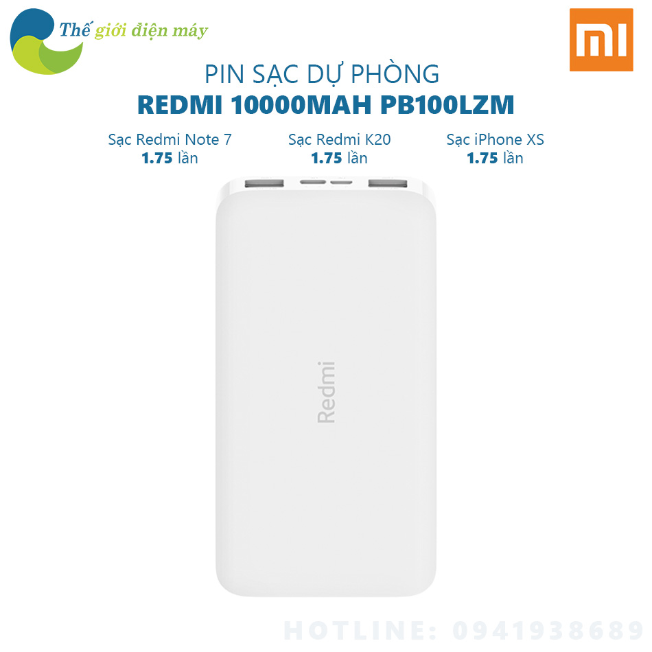 Pin sạc dự phòng Redmi có dung lượng lên đến 10000mAh cho khả năng đáp ứng đầy đủ nhu cầu sạc cho nhiều thiết bị khác nhau. Với dung lượng lớn pin sạc đáp ứng được nhu cầu sử dụng cao từ làm việc đến giải trí. Bên cạnh dung lượng cao, Redmi PB100LZM còn cho khả năng sạc khá nhanh, với Redmi Note 7 và Redmi K20 pin sạc cần thời gian sạc đầy khoảng 1.75 giờ, Xiaomi Mi 9 khoảng 2,2 giờ và iPhone XS khoảng 2,3 giờ.