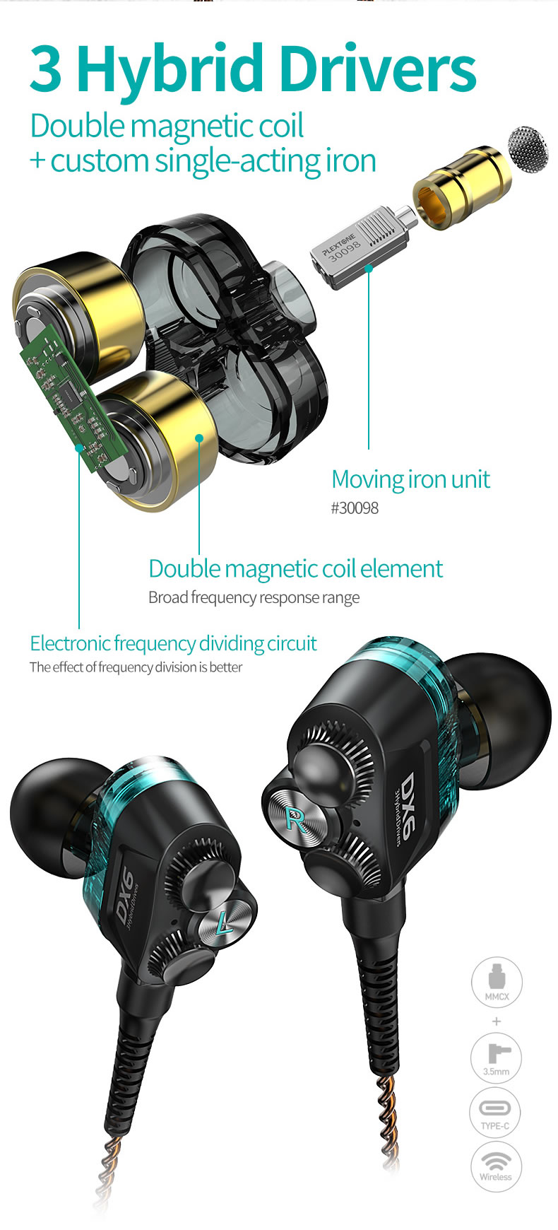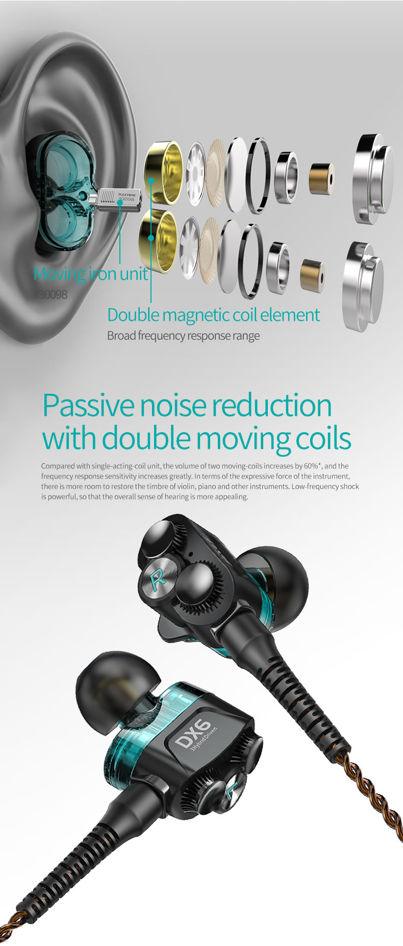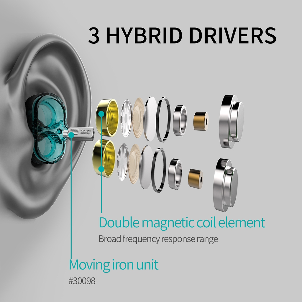 Tai nghe có dây Plextone DX6 được thiết kế dạng Triple Hybrid Drivers: 2 Dynamic Drivers và 1 Balanced Armature Driver (BA) mang đến cho người dùng chất lượng âm thanh tuyệt vời. Thiết kế in-ear giúp cách âm tốt hơn, hạn chế những tiếng ồn xung quanh khi đang nghe nhạc.