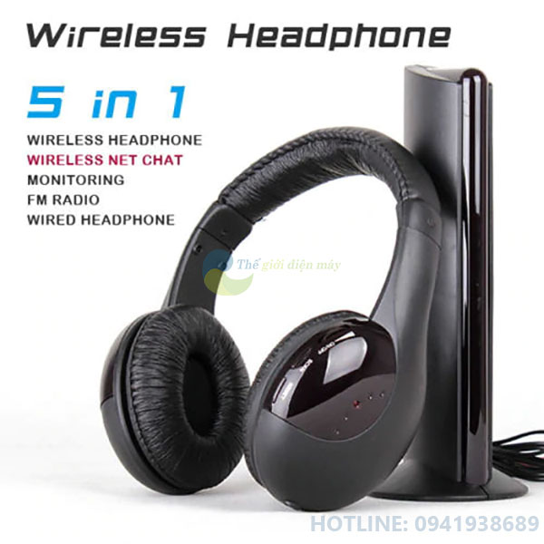 Lưu ý: Tai nghe không dây 5 trong 1 này đi kèm với micrô được đặt ở mặt dưới của máy phát. Máy phát và máy thu phải được cung cấp năng lượng bởi hai pin 7 cell và có thể được trang bị bộ đổi nguồn (tùy chọn). Việc sạc pin phụ thuộc chủ yếu vào chất lượng pin bạn đã mua. Máy này tiêu thụ một lượng nhỏ điện cực