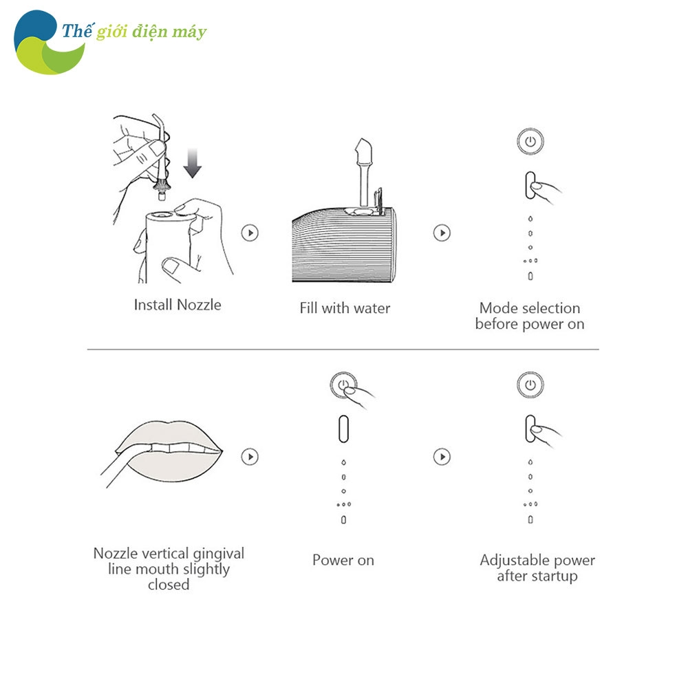 – 4 loại đầu phun với vòi tiêu chuẩn, vòi chỉnh nha, vòi làm sạch túi nha chu, vòi làm sạch lưỡi.