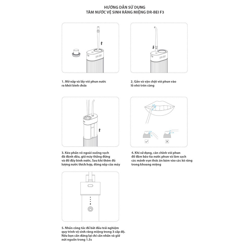 Việc sử dụng tăm nước vệ sinh răng miệng DR.BEI F3 hàng ngày sẽ giúp loại bỏ các mảng bám, mảnh vụn thức ăn còn sót lại trong khoang miệng, đặc biệt là các kẽ răng. Bên cạnh đó, hạn chế tối đa chảy máu chân răng, viêm nha chu và sâu răng.