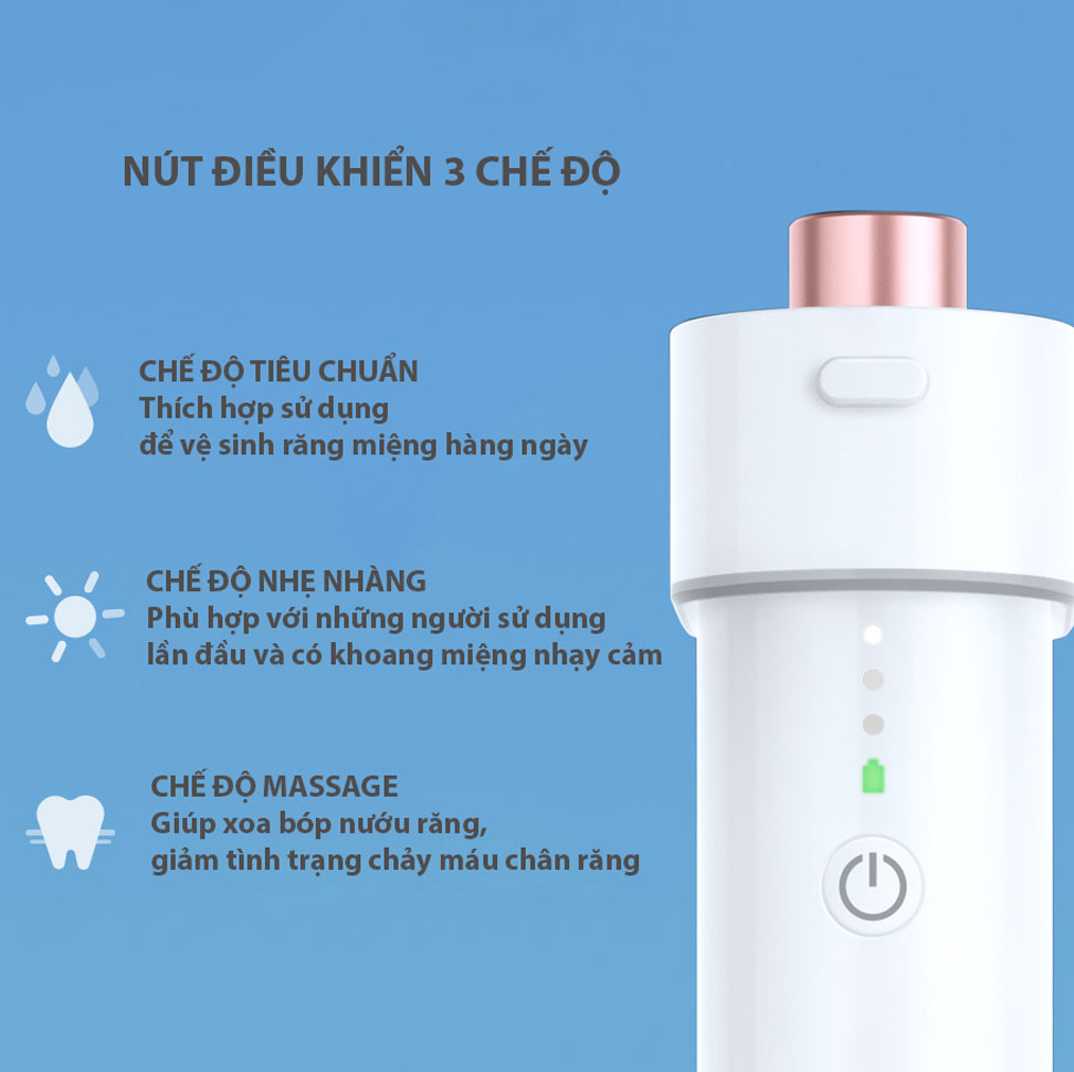 Tăm nước DR.BEI F3 được trang bị nút điều khiển 3 cấp độ, mỗi cấp độ tương ứng với một áp lực nước khác nhau đáp ứng đầy đủ nhu cầu người dùng. Cụ thể, chế độ tiêu chuẩn thích hợp sử dụng để vệ sinh răng miệng hàng ngày. Chế độ nhẹ nhàng phù hợp với những người lần đầu sử dụng và có khoang miệng nhạy cảm. Cuối cùng là chế độ massage giúp xoa bóp nướu răng, giảm tình trạng chảy máu chân răng.