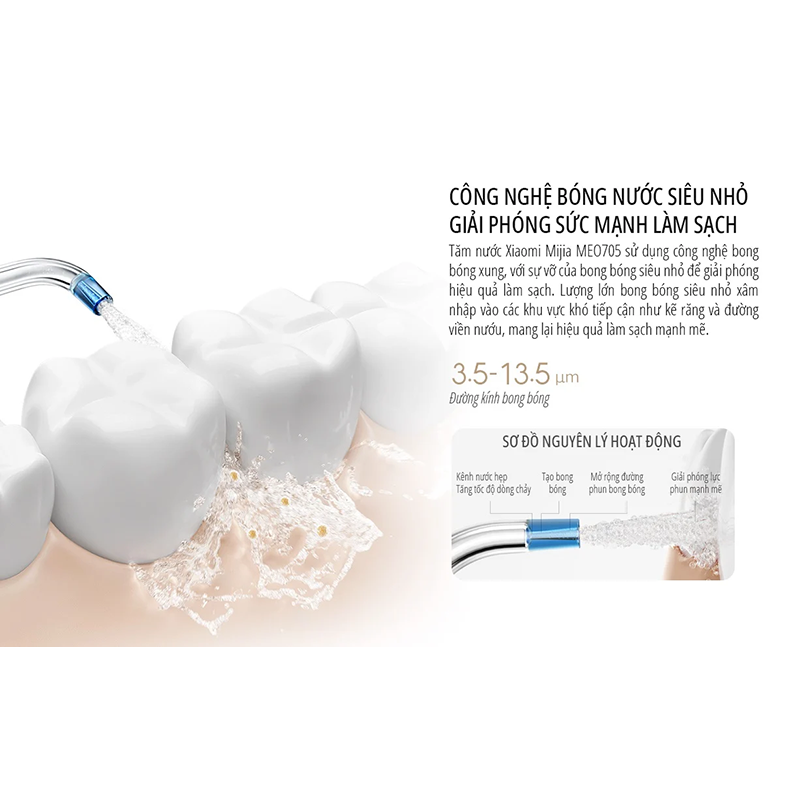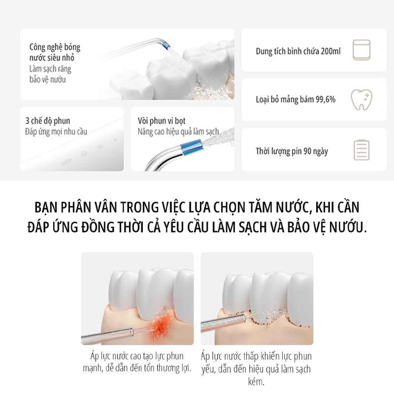 Bạn đang gặp khó khăn trong việc tìm một chiếc máy tăm nước nha khoa chất lượng để vừa có thể làm sạch hiệu quả vừa bảo vệ nướu tối ưu. Bởi nếu sử dụng tăm nước áp lực nước cao và va đập mạnh thì dễ gây chảy máu còn nếu tăm nướcáp lực nước nhỏ, va đập yếu sẽ không làm sạch hiệu quả. Máy tăm nước Xiaomi Mijia MEO705 với 3 chế độ phun tùy chỉnh, công nghệ phun bong bóng micron, 2 vòi chuyên biệt, đầu xịt siêu nhỏ đi kèm pin 90 ngày,... Chắc chắn sẽ là lựa chọn tuyệt vời dành cho người niềng răng, với khả năng loại bỏ gần như 99% mảng bám, giúp làm sạch khoang miệng một cách toàn diện nhất.