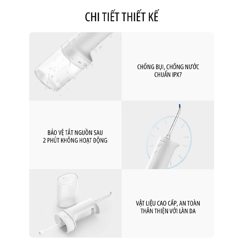 Ngoài ra, thiết bị còn được tích hợp chuẩn kháng nước IPX7, giúp tăm nước có thể hoạt động ổn định và bền bỉ trong môi trường ẩm ướt hay thậm chí bạn có thể vệ sinh trực tiếp dưới vòi nước mà không lo ảnh hưởng đến các linh kiện điện tử bên trong.